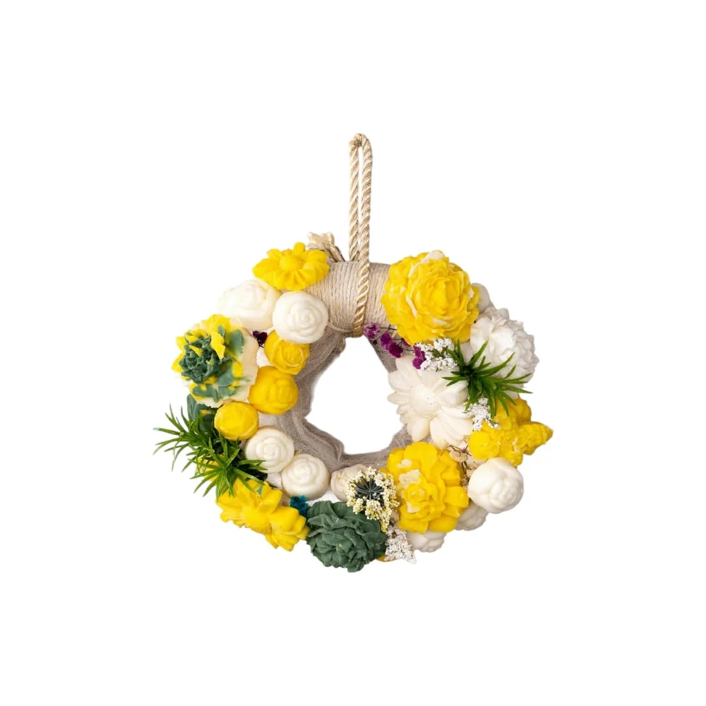 Χειροποίητο κερένιο στεφάνι διακοσμημένο με λουλούδια, σχεδιασμένο για να δίνει μια κομψή και ζεστή πινελιά σε κάθε χώρο. Ιδανικό για διακοσμητικό χώρου που μπορεί να κρεμαστεί στον τοίχο, ανανεώνοντας την ατμόσφαιρα του σπιτιού σας.